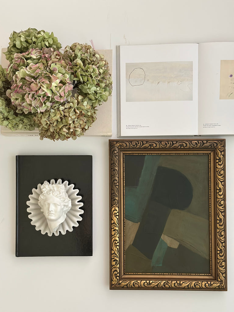 All frames retain typical marks due to their age, which adds character to the piece and accentuates the passage of time while surrounding the newly created painting. Together, the past embraces the present in one cohesive expression.